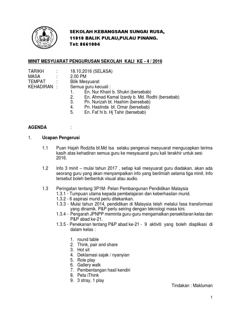 Muat turun halaman 1-5 di FlipHTML5. Format dan contoh minit mesyuarat seperti Lampiran 5 dan Lampiran 6. Hjh janatu sapuan en.